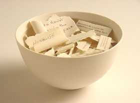 cradle-like forms. 'I like the fact that it can rock, and that it's quite sculptural, rather than a vessel, which was what was putting me off some of the other pieces really, and I decided to marry the idea of this object with the simple quality.... of the creamware. Its having a bone-like quality... became important as an idea.... The emptiness is about however it might be read by the viewer really because it's expectant, it's about potential, and absence implies a presence. I was also thinking of the poignancy of an empty cradle..... perforations, empty, ashes, mummy-like object, salt, photo on salt, safety pin, still, very discreet embossed. This is very much a journey in terms of these ideas.' |